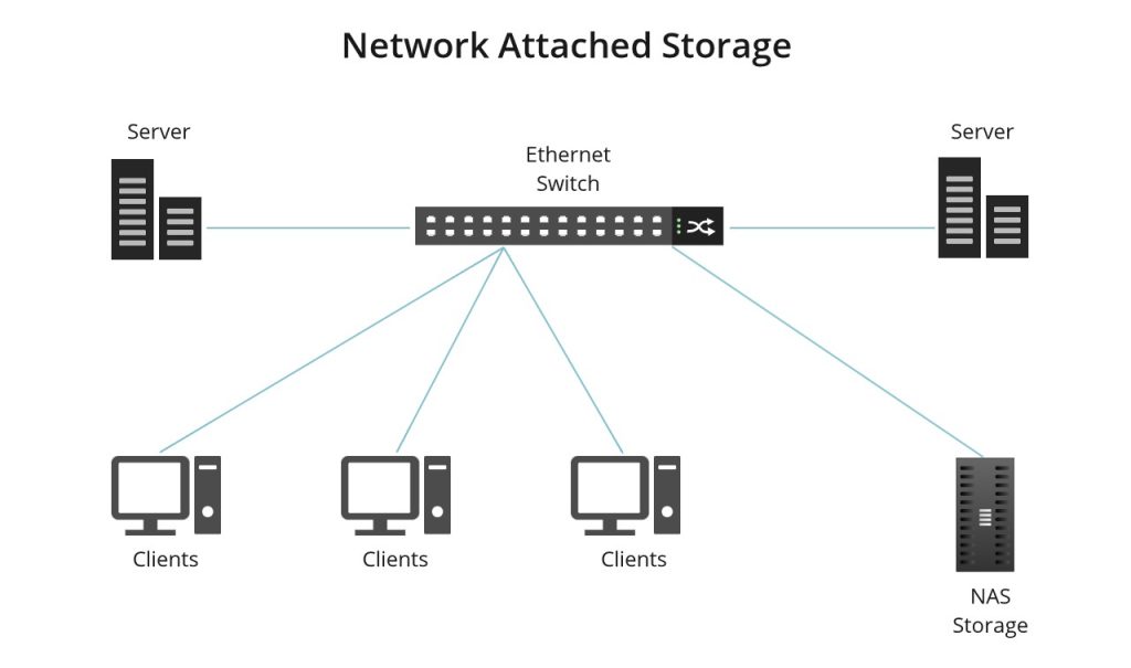 NAS ( Network Attached Storage ), là một hệ thống lưu trữ dữ liệu được kết nối với mạng, cho phép nhiều người dùng và các thiết bị khác nhau truy cập và chia sẻ dữ liệu một cách dễ dàng. Khác với các phương pháp lưu trữ khác như DAS (Direct Attached Storage) và SAN (Storage Area Network), NAS tập trung vào việc cung cấp dung lượng lưu trữ lớn và khả năng truy cập từ xa thông qua mạng.