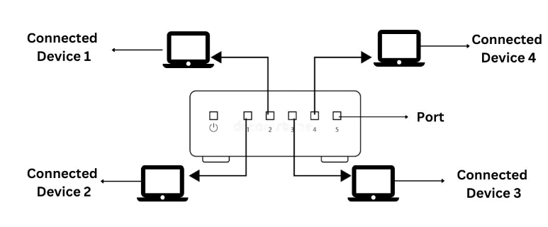 Hub là một thiết bị mạng bao gồm nhiều cổng. Mỗi cổng có thể kết nối một thiết bị. Nhiều thiết bị được kết nối với hub thông qua các cổng này. Một thiết bị được kết nối, chẳng hạn như 1, sẽ gửi khung (người gửi). Khung này sẽ được gửi đến tất cả các thiết bị được kết nối (người nhận), chẳng hạn như 2, 3 và 4 trong trường hợp này.